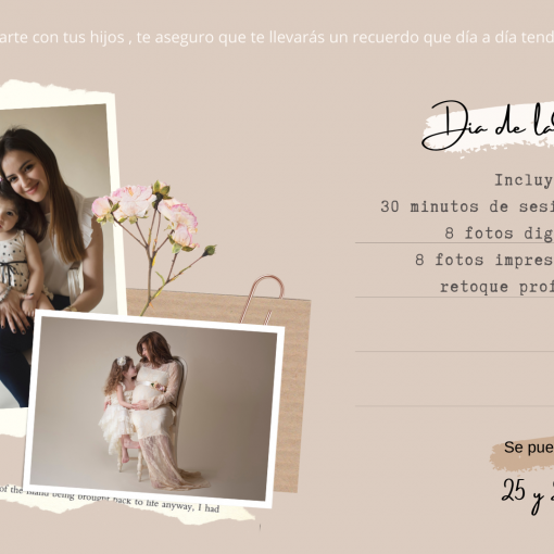 Se trata de una sesión en la que voy a hacerle unos retratos a ella y luego a todo el grupo familiar, la vamos a mimar , a hacerla sentir especial , que disfrute su día como merece. Y cuando? Cuando ella quiera ..por eso prepare una gift card con una hermosa presentación para que le regales y que ella pueda agendar cuando desee.